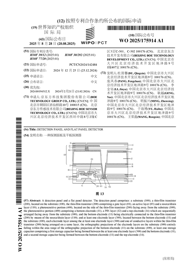 京东方A公布国际专利申请:“一种探测面板及平板探测器”